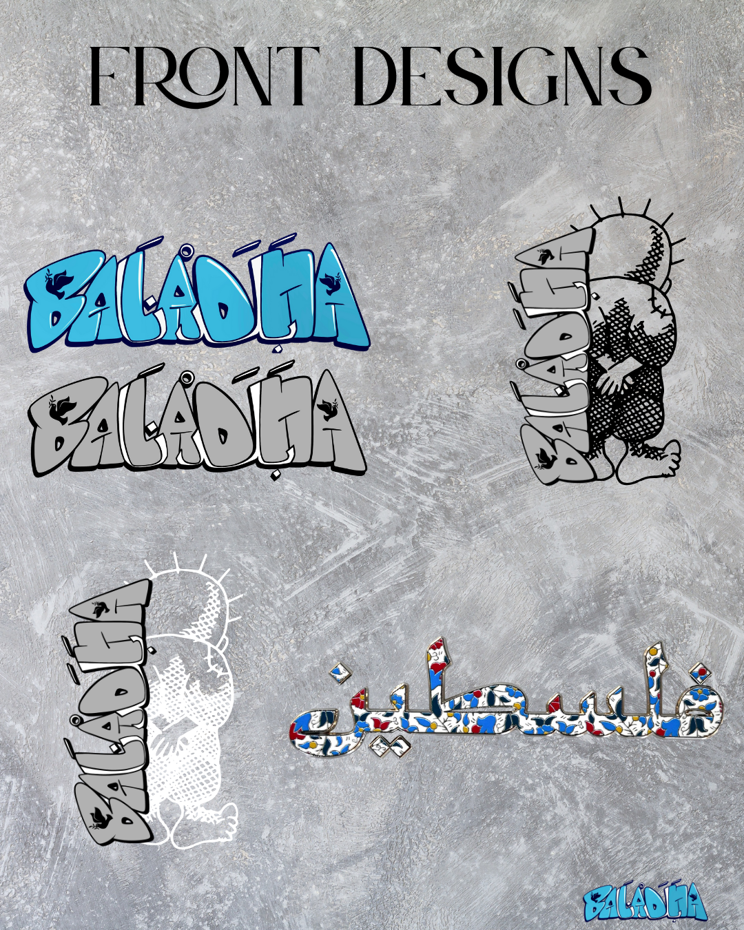 | Front Design | Baladna Grey, Baladna Blue, Handala Black, Handala White, Palestine Multicolor |